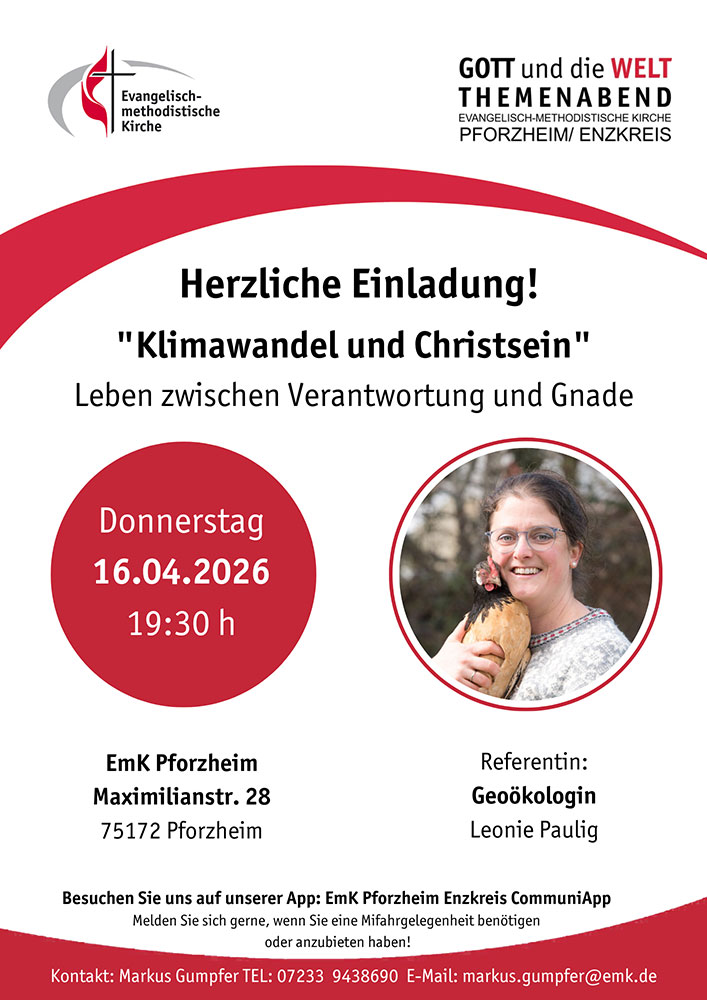 Die Reihe „GOTT und die WELT Themenabend“ wird von den fünf Evangelisch-methodistischen Gemeinden im Bezirk Pforzheim/Enzkreis gestaltet.