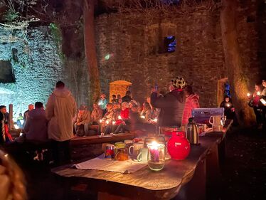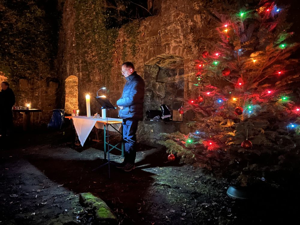 Samstag, 13. Dezember 2025 um 17:00 Uhr war es wieder soweit. Ca. 20 Personen, Große und Kleine, Alte und Junge, starteten wieder hinter der Evangelischen Stadtkirche zu einer Miniwanderung zur Ruine. Besonders die Kinder hatten großen Spaß und führten in diesem Jahr mit Fackeln und Taschenlampen den Zug durch den dunklen Schlosswald an. Oben angekommen, wurden sie in der wunderschön, mit unzählig vielen Kerzen und einem Weihnachtsbaum, geschmückten Ruine von einem großen Lagerfeuer und festlichen Klängen des Posaunenchors, aus Bläser:innen der Evangelischen und der Evangelisch-methodistischen Kirche, empfangen.
