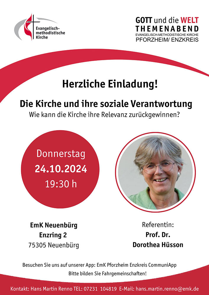 Die Reihe „GOTT und die WELT Themenabend“ wird von den fünf Evangelisch-methodistischen Bezirken im Verbund Pforzheim/Enzkreis gestaltet.